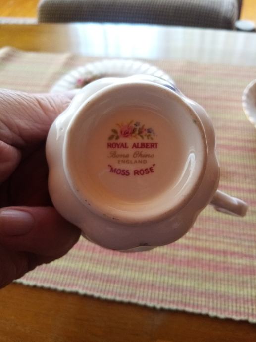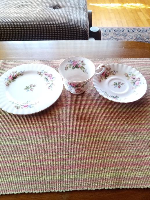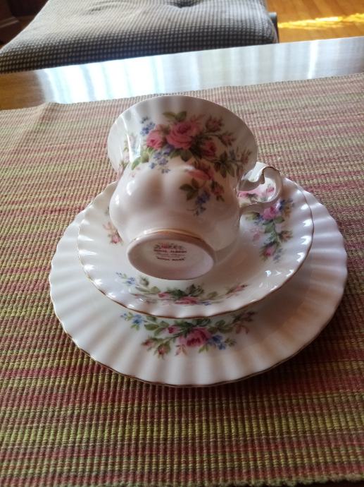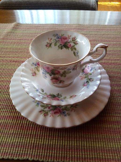 Royal Albert Moss Rose. Šalica, podtanjurić i tanjurić za desert. Engleski vrhunski porculan u super stanju ko novi. Za 1set cijena je 40,a za 2 i više setova 35. Set (šalica, podtanjurić i tanjurić za desert). Šalice su veće.Mogu za kavu i čaj.