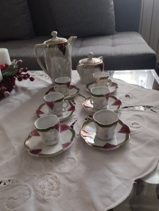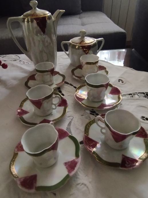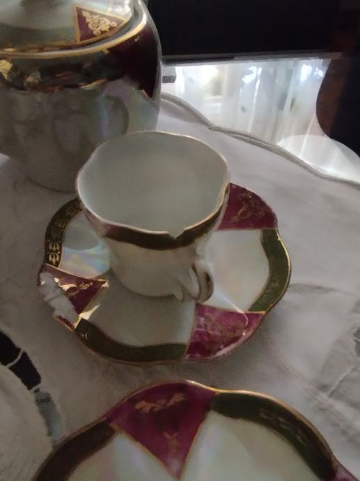 Servis je iz tridesetih godina 20.st. izrađen iz vrlo tankog porculana poznata Česka manufaktura Meier MCP. (6 šalica,tanjurića,posuda za šećer i posuda za kavu). Jedna šalica i tanjurić su oštećeni(vidljivo na foto) sačuvani zbog kolekcije.