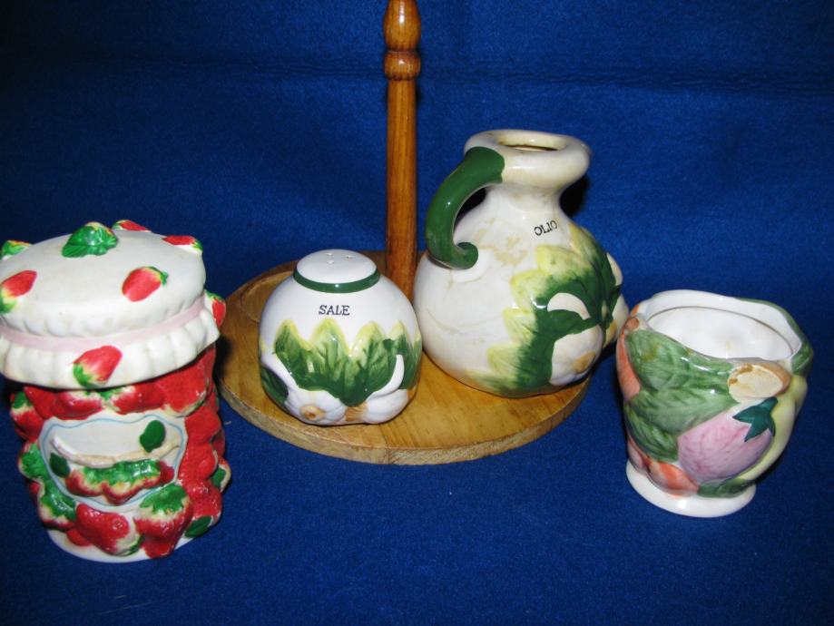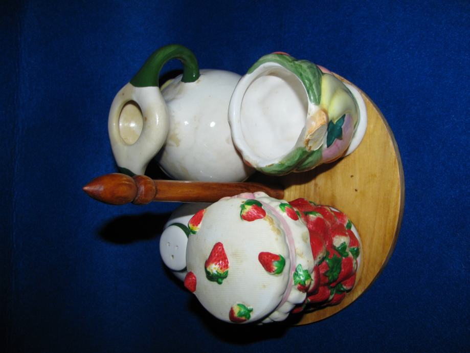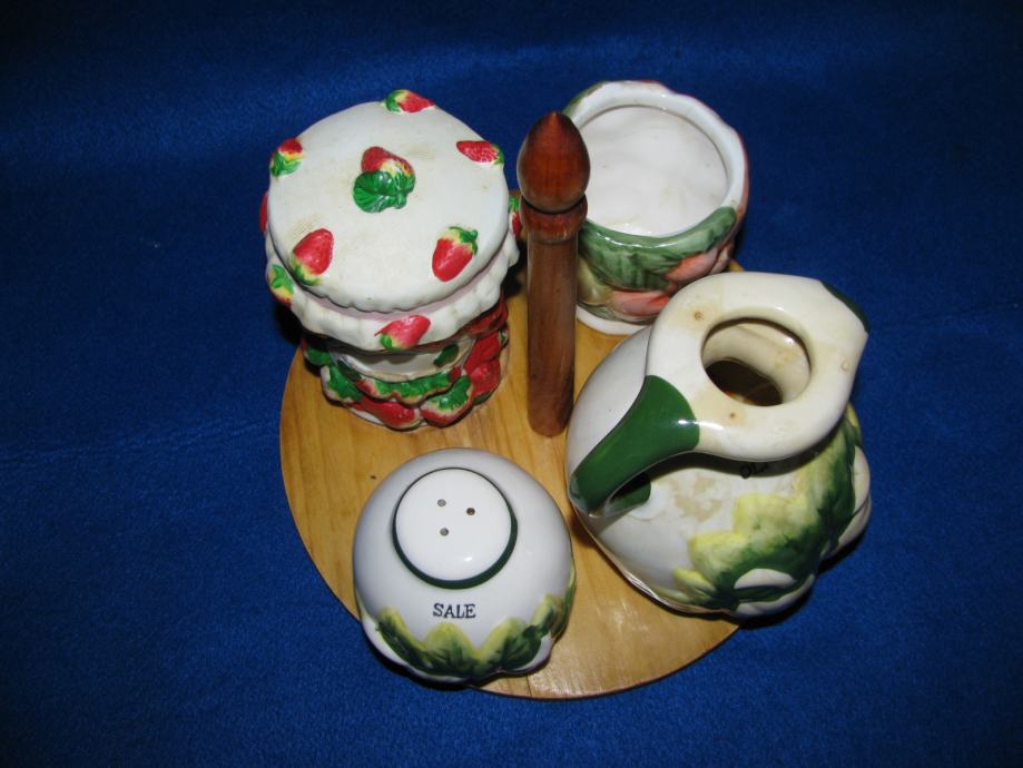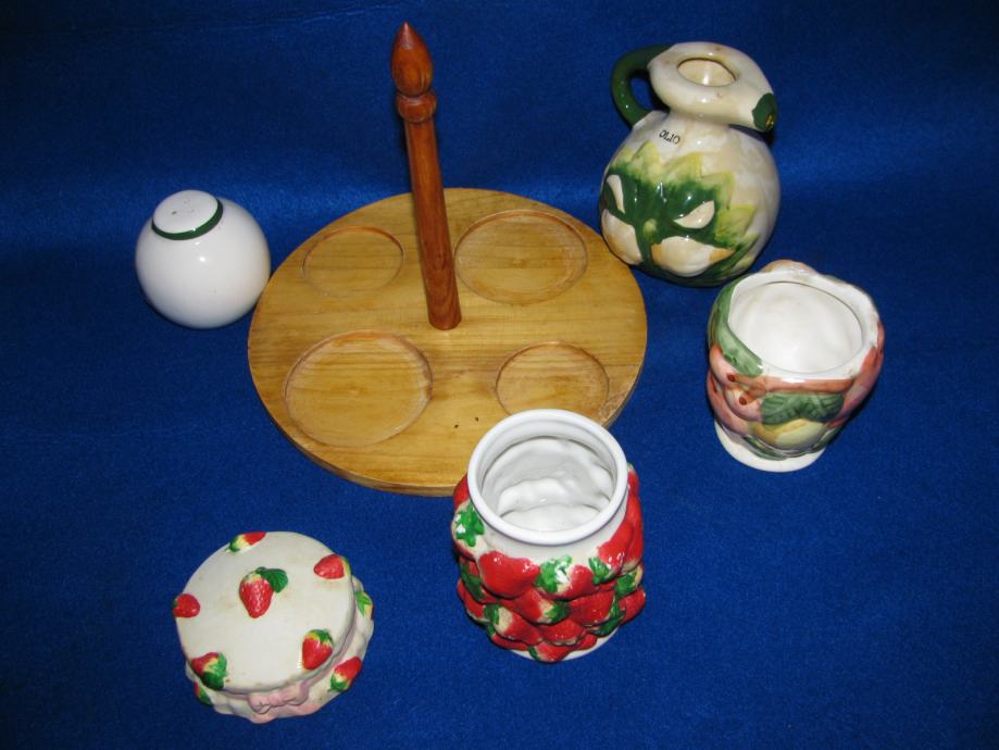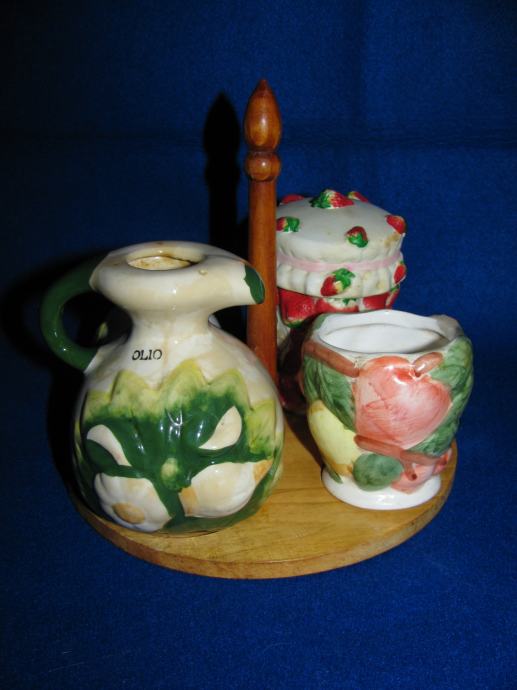 Set na drvenom nosaču, dvije original keramika posude za sol i ulje.