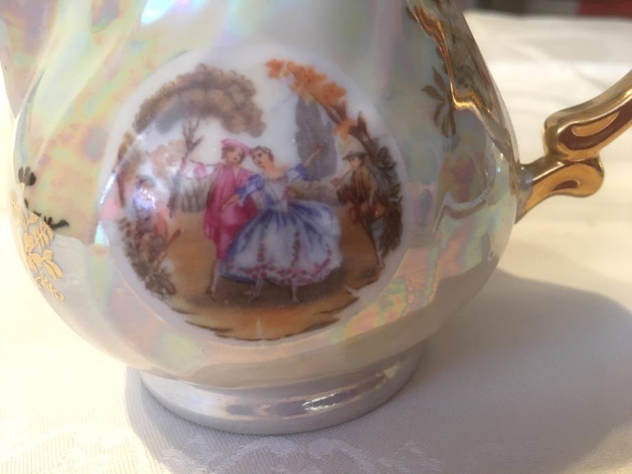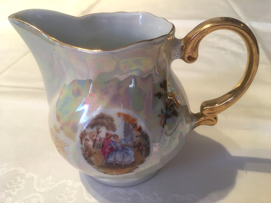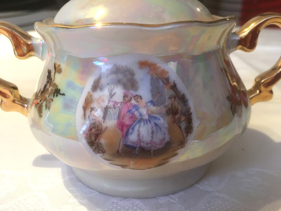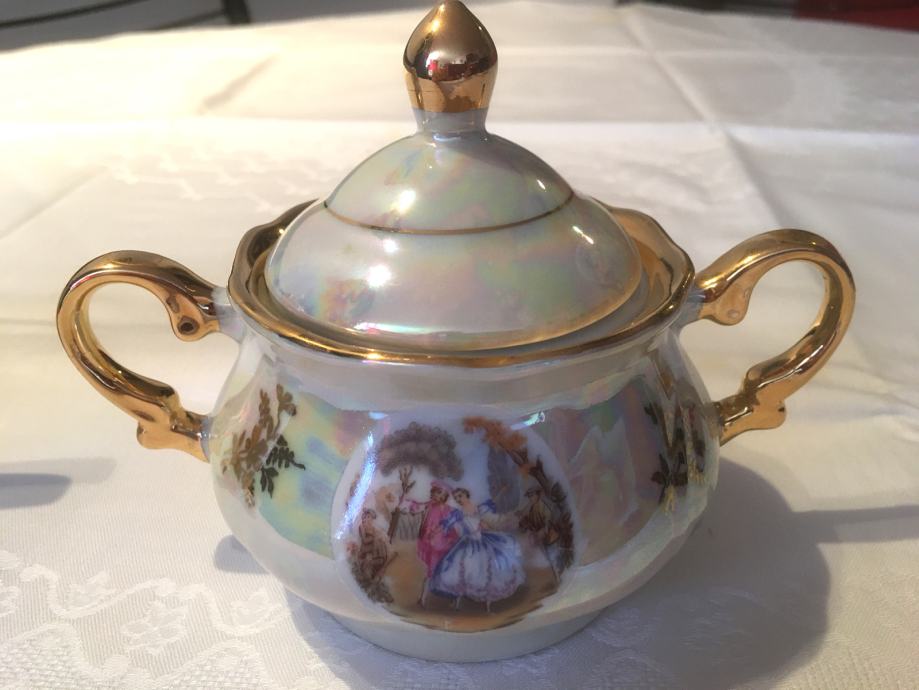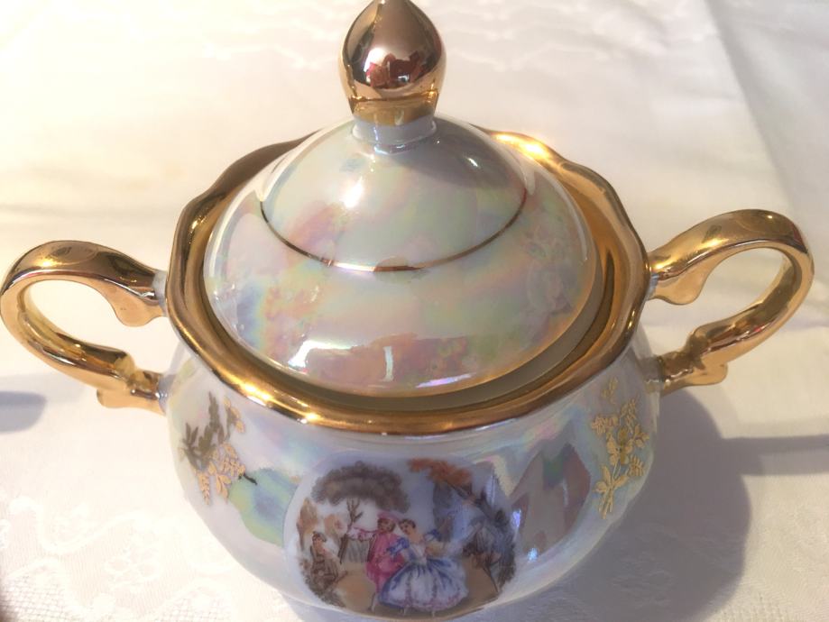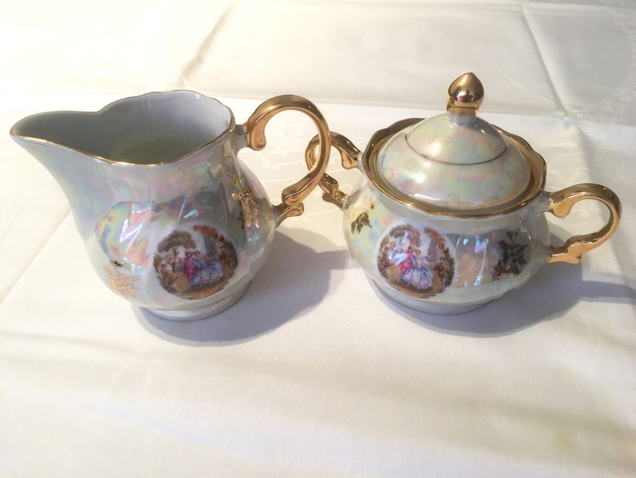 Prodajem porculanski pozlaćeni set, starinski, kao nov, sastoji se malog vrča za mlijeko i posudice za šećer sa poklopcem.