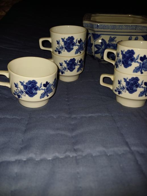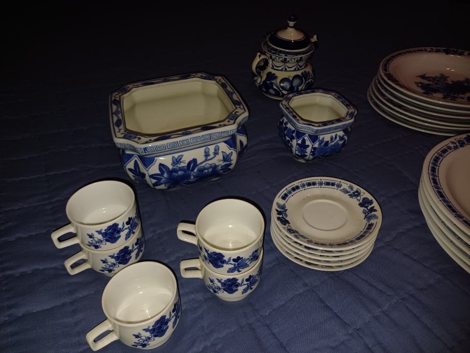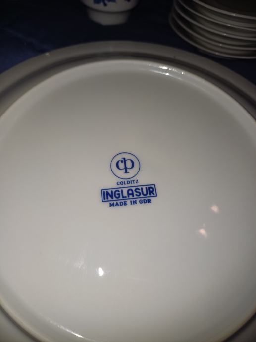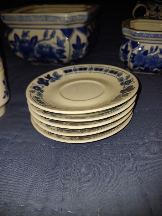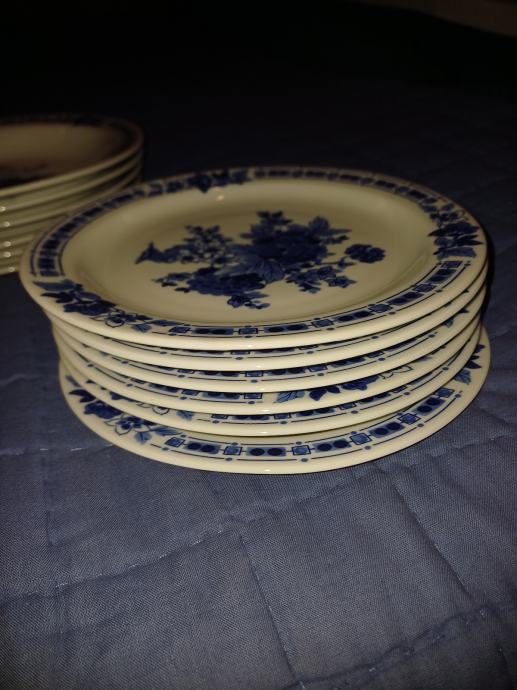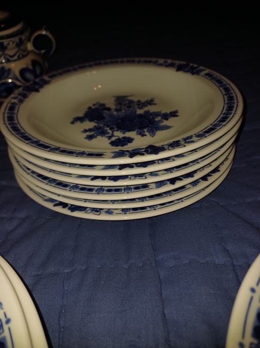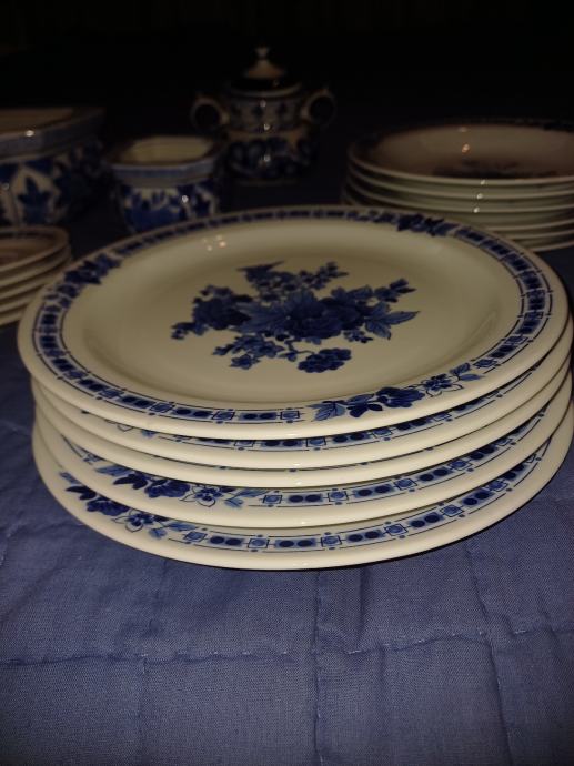 Prodajem komplet modro bijelog porculanskog posuđa, poznatog njemačkog proizvođača GDR, model inglasur, sastoji se od 6 plitkih pijata, 6 dubokih, 5 desertnih, 5 šolja i 5 pijatiča za kavu, zdijelica za šečer, zdijelica za sol, te dvije kockaste zdijele za kekse i bombone, cijena seta je 70 eura.