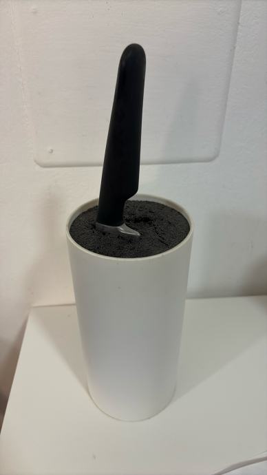 Prodajem spremnik za noževe bijele boje, cilindričnog oblika, s unutarnjim punjenjem od fleksibilnih plastičnih vlakana koja drže noževe na mjestu. Takav dizajn omogućuje pohranivanje noževa različitih veličina bez fiksnih utora.