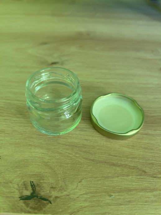 Prodajem male staklene teglice sa zlatnim poklopcem. Cijena 0,20 centi po teglici.