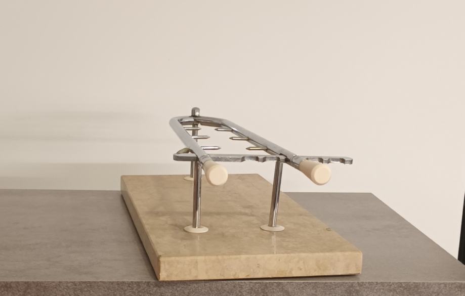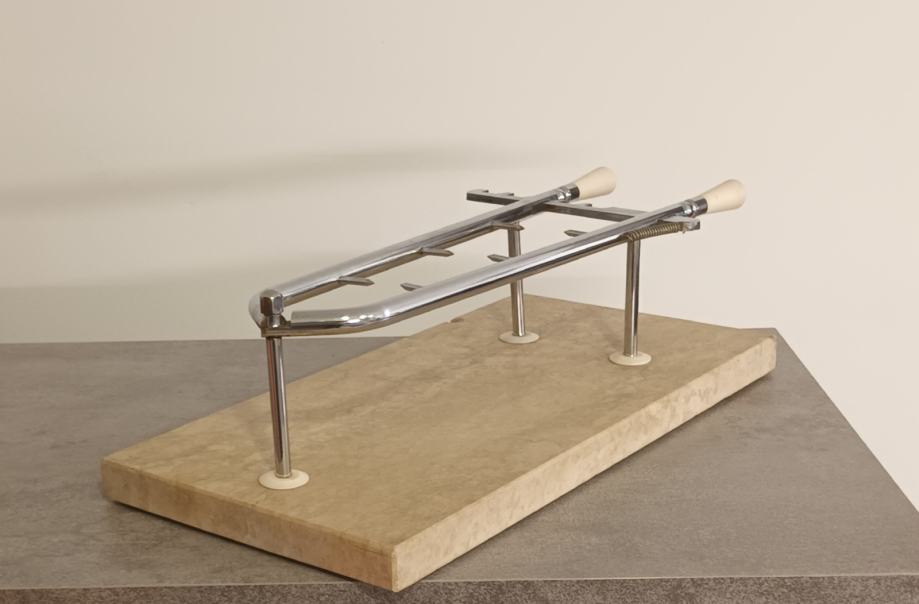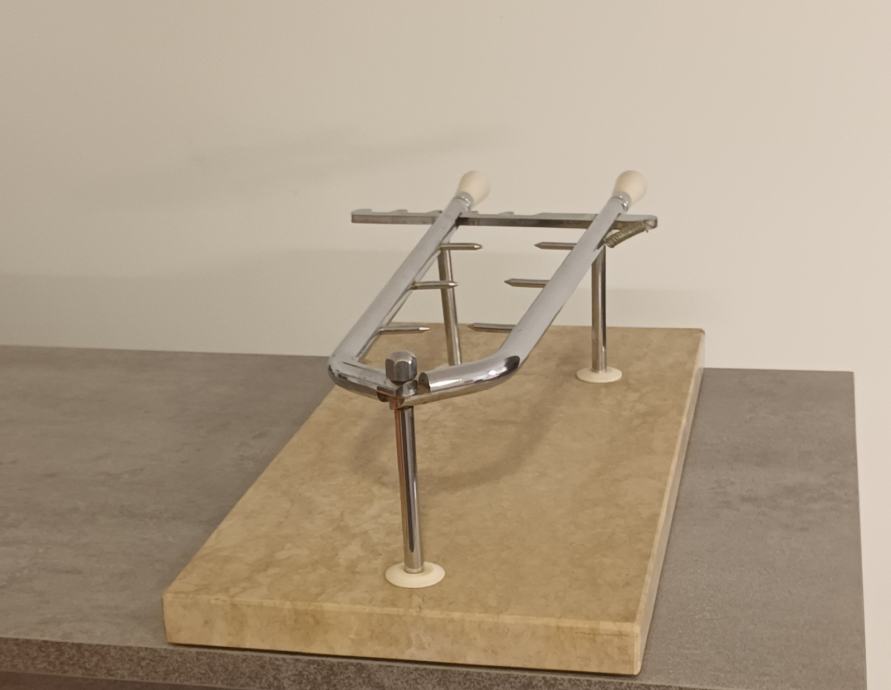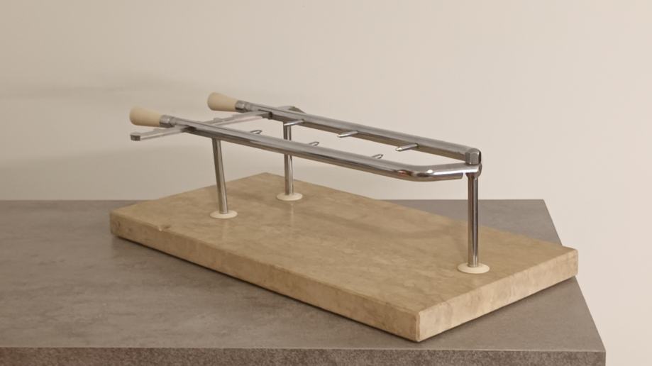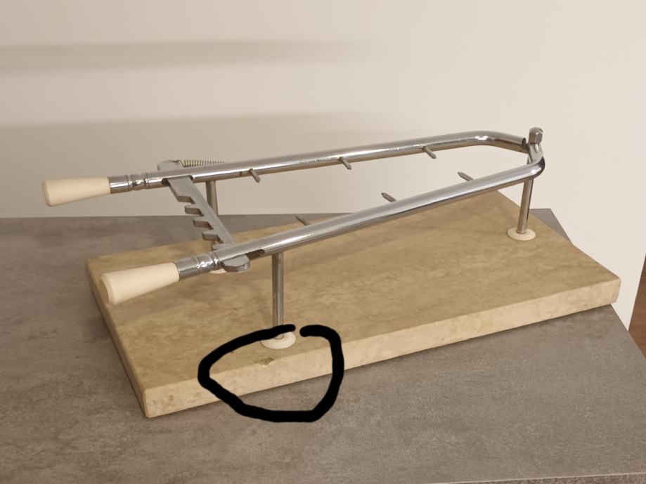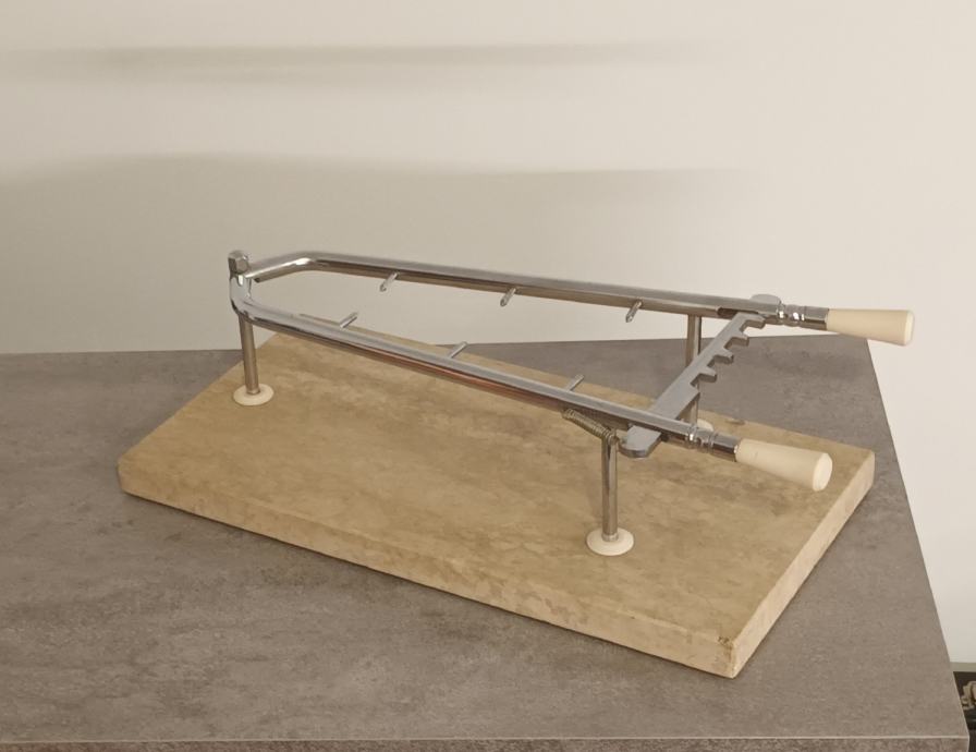 Stalak za pršut sa slika malo korišten, stanje vidljivo na slikama. Stalak je puni inox i mramor postolje 50 x 25 x 3 cm sa neznatnim oštećenjem mramora, prikazano na slici.