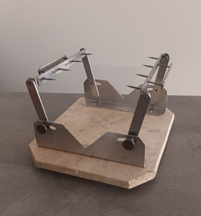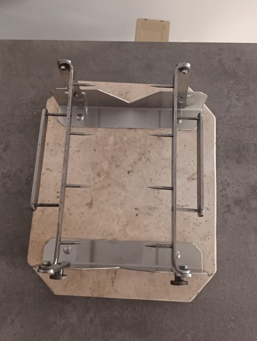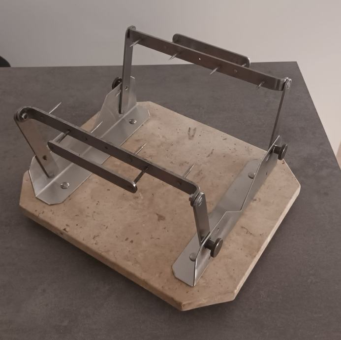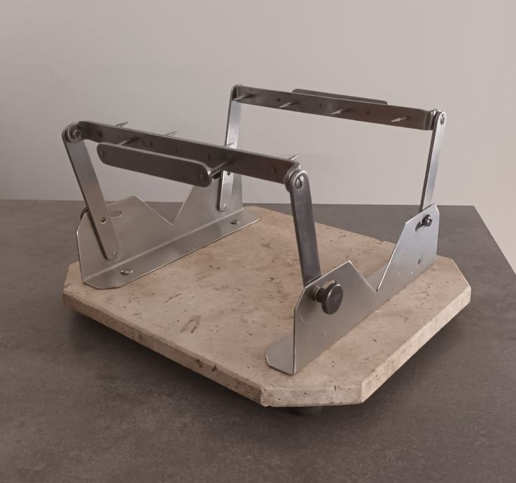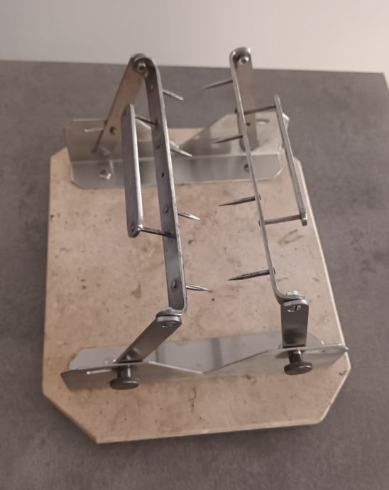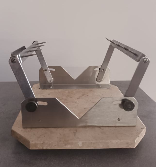Stalak za pršut sa slika kombinacija mramor - inox, postolje 25 x 30 cm, maksimalno otvaranje klješta 20 cm.