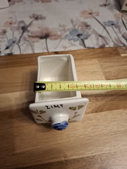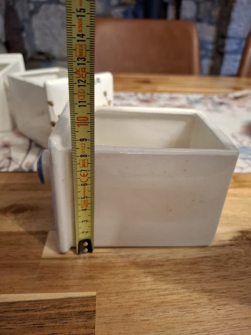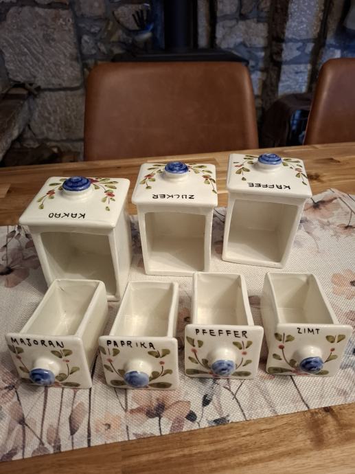 Prodajem set starih keramičkih posudica za začine i namirnice. Radi se o setu od sedam komada — tri veće posudice s poklopcima (označene kao Kakao, Zucker i Kaffee) te četiri manje otvorene posudice (Majoran, Paprika, Pfeffer i Zimt).