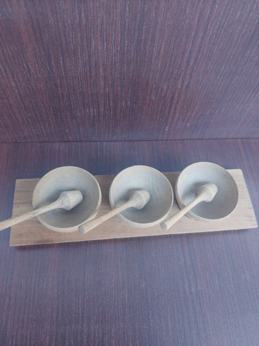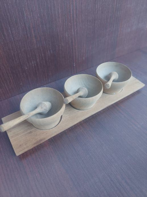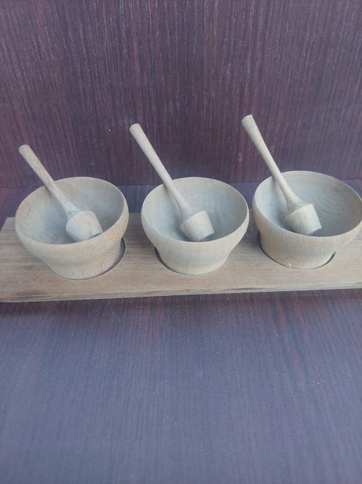 Starinski drveni set za začine- tri drvene posudice s tučkom.