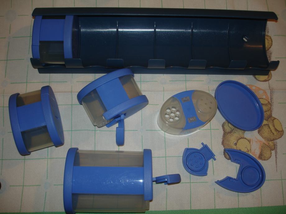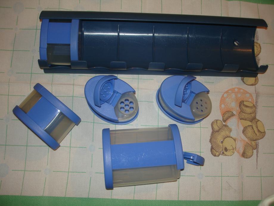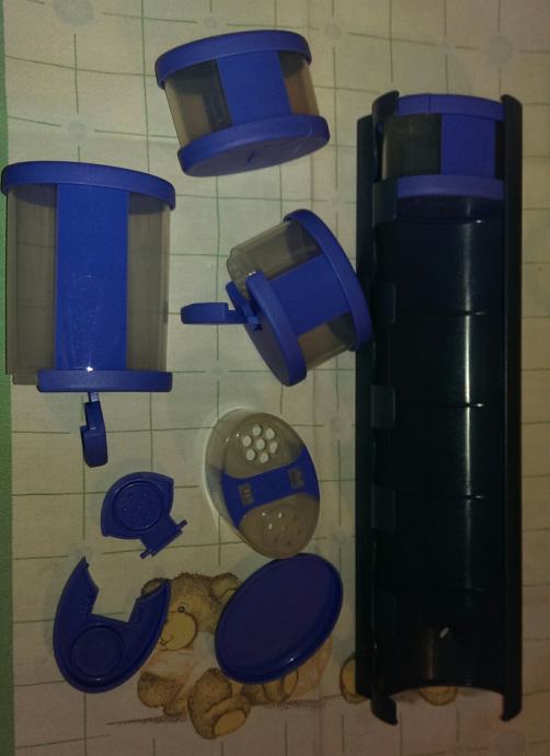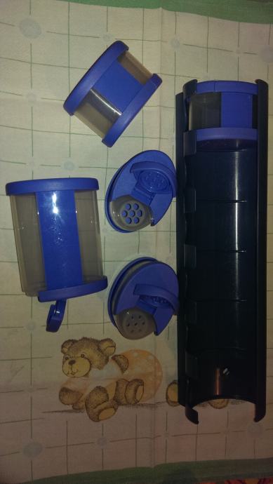 Tupperware orient express zidni stalak za začine. Jako malo korišten. Kao novi. Puna cijena oko 60e .Dostava po dogovoru nakon vidjive uplate na računu. 4 male posudice i jedna veća. Sve se rastavlja radi lakšeg pranja. Na poklopcu dvije vrste rupica manje i veće, ovisno koji začin stavite unutra jednostavno rukovanje. Dno se skida cijelo za punjenje posude. Pogledajte i ostale moje oglase.