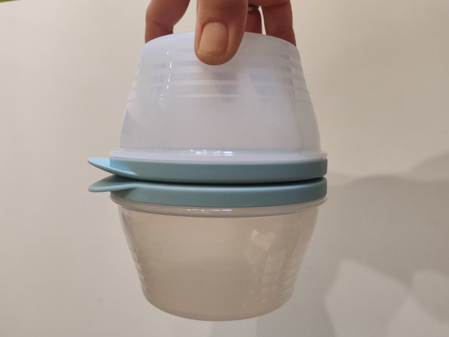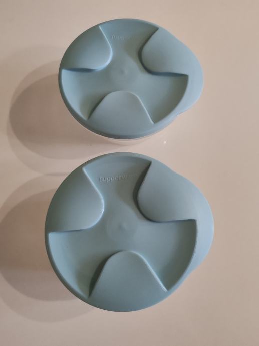 Posuđe imaju hermetički poklopac svijetlo plave boje, svaka je zapremnine 500 ml. Odlične za transport ili pohranu hrane. Kad se spoje strane sa poklopcima posude se "zalijepe". Sigurne za transport zahvaljujući poklopcu, tako da se tekućina neće izliti. Od skladištenja ima par površnih crtica na poklopcu,ali ništa strašno. Vidljivo na zadnjoj slici.