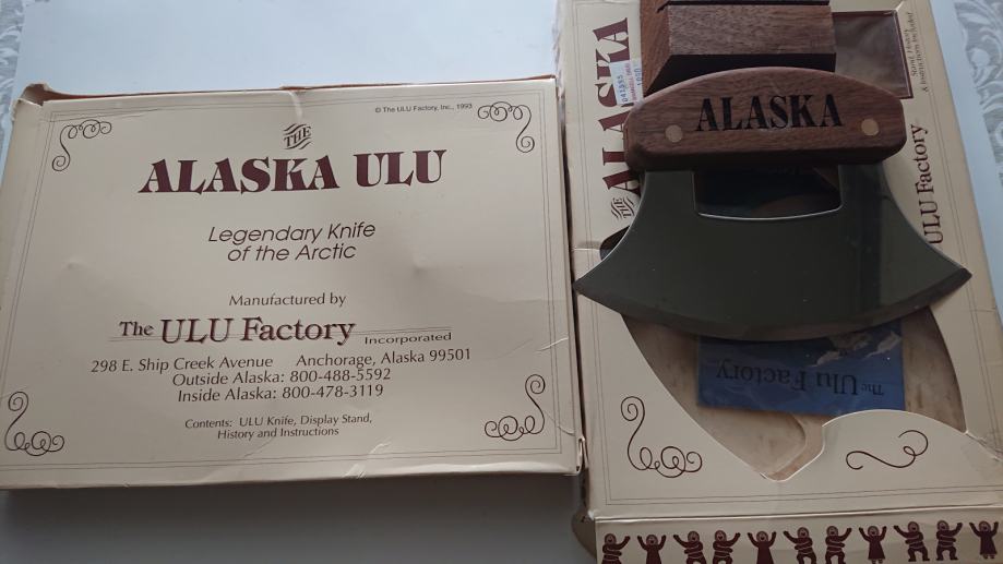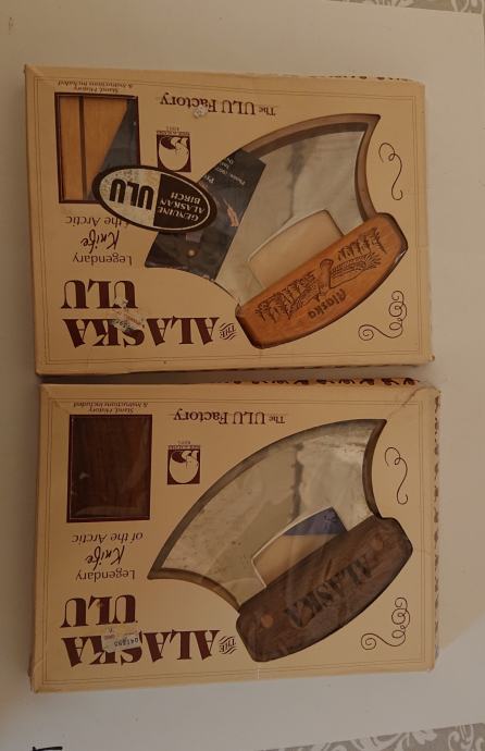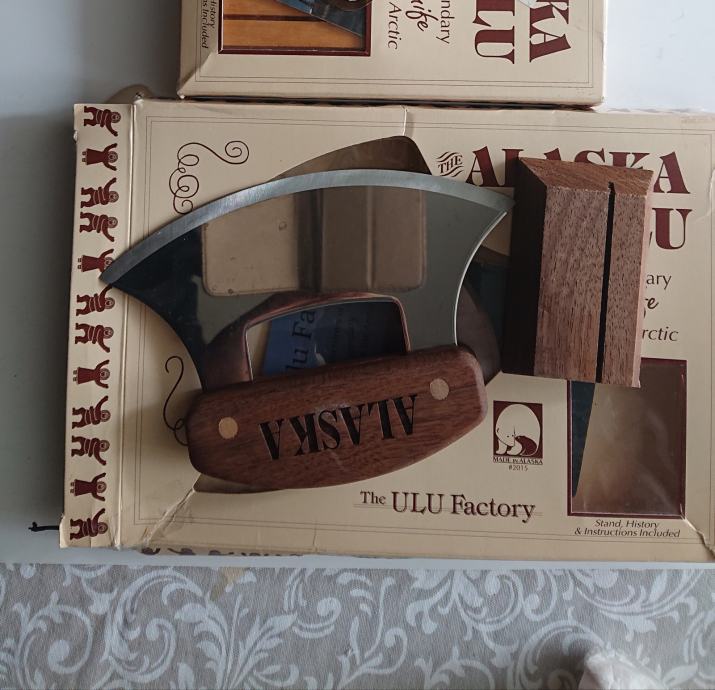 Na prodaju je jedan novi Ulu nož sa postoljem u kutiji iz ULU tvornice, Aljaska, s dizajnom Mt. McKinley. Novo, nikad korišteno. Na kutiji se vidi malo istrošenosti, od stajanja. Oštrica od nehrđajućeg čelika naoštrena samo s jedne strane na tradicionalni način domorodaca Aljaske. Laserski urezane ručke od zlatne aljaške breze i američkog oraha. Tradicionalni Ulu nož je inuitski, (eskimski), nož za deranje kože. Ovo je višenamjenski nož u vašoj kuhinji. Izvrstan je za rezanje pizze, povrća i sjeckanje začinskog bilja. Voljet ćete imati ovo u svojoj kuhinji zbog jedinstvenog izgleda. Izvrstan je dar nekome tko voli pripremati hranu. Proizvedeno u SAD-u Anchorage Alaska, The Ulu Factory