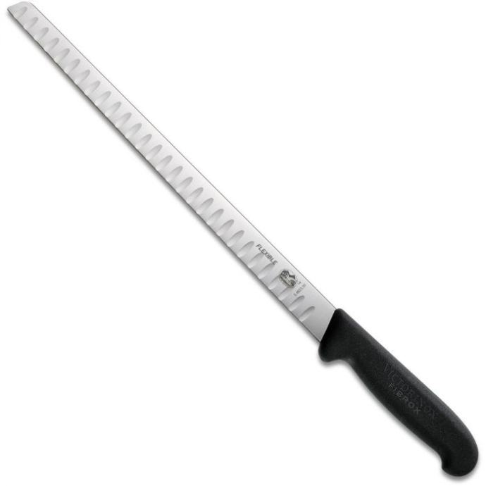 Fleksi nož za rezanje šunke, pršuta, kolača. Oštrica dužine 30cm je fleksibilna s udubljenjima koji pomažu da se hrana ne lijepi na oštricu prilikom rezanja. drška je izrađena od fibrox materijala.