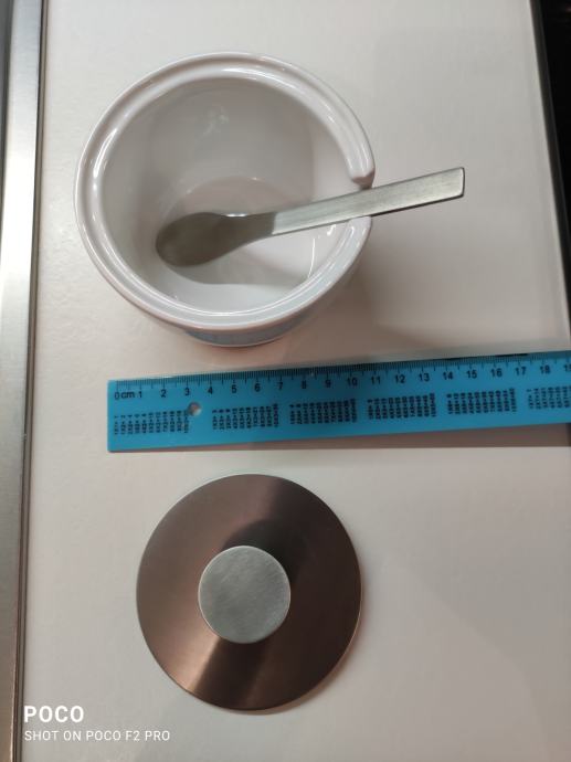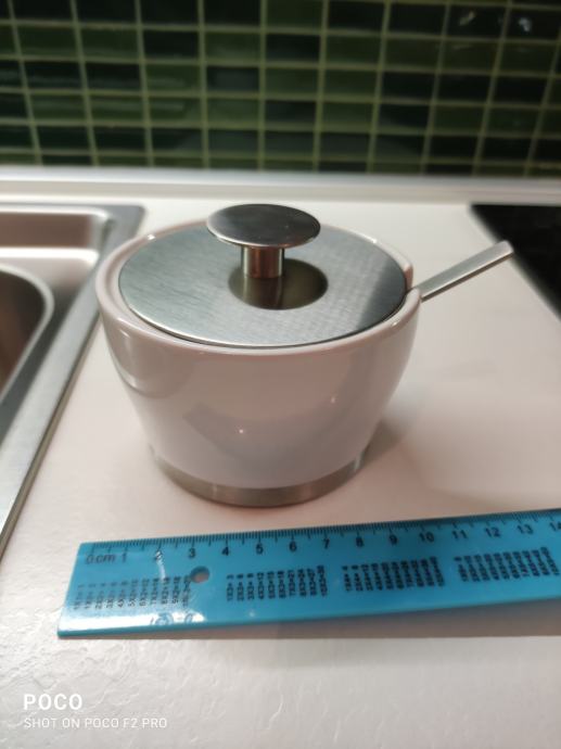 Zdjelica za šećer, nekorištena. Zdjelica je od keramike, a poklopac od čelika. Uz nju dolazi i žličica od čelika. Cijena 30 kn.