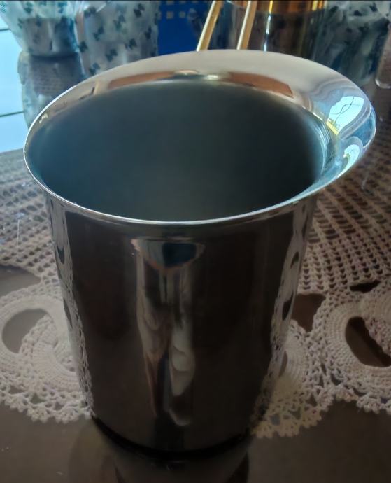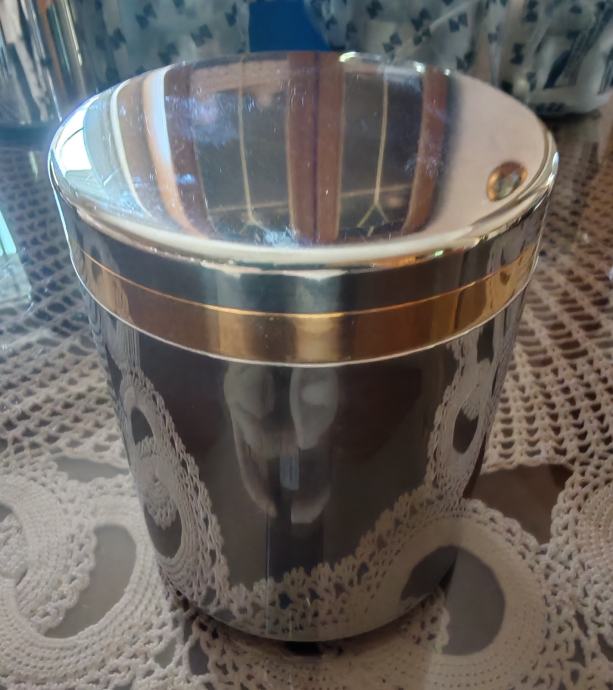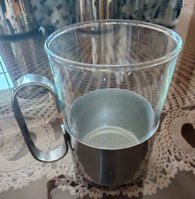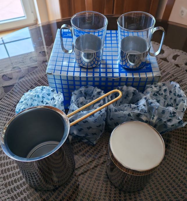 Prodajem Zepter set šalica s drškom za 6 osoba. Set je potpuno novi, nikad korišten, zapakiran u originalnoj kutiji. Postolje šalice je od nehrđajućeg poliranog čelika Cr Ni 18/10, a u postolju s drškom je odvojiva staklena šalica. Visina je 10 cm, a promjer 7 cm. Uz set šalica ide i posuda za šećer visine 11 cm, promjera 9 cm i posuda za kuhanje kave ili čaja visine 14 cm, promjera 10 cm. Sve je od kvalitetnog zepter nehrđajućeg čelika s pozlaćenim elementima kao na slici.