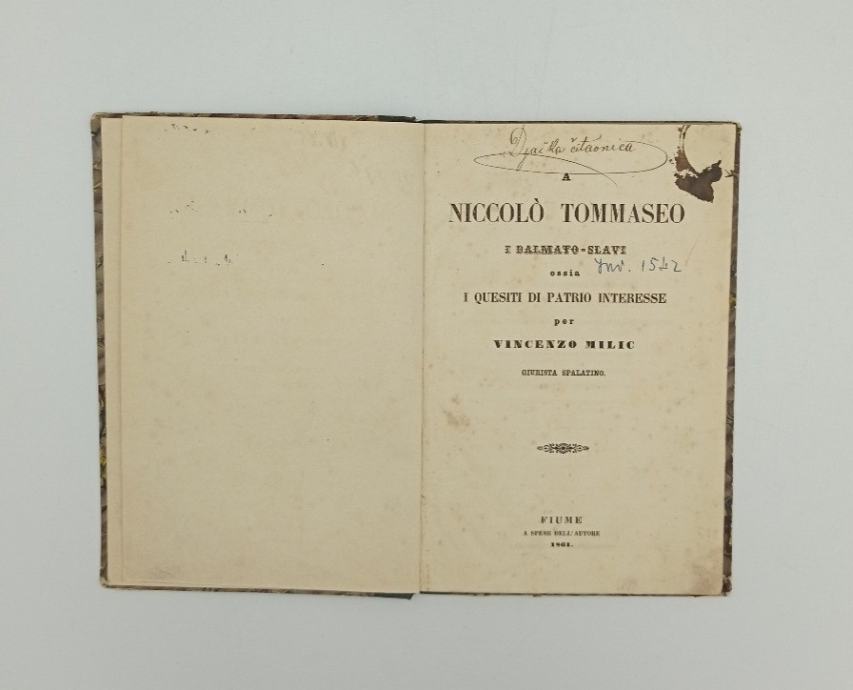 Vinko Milić: A Niccolo Tommaseo i Dalmato-Slavi ossia i quesiti di patrio interesse Stranica: 95Dimenzije: 14.5x21.5Jezik: RijekaPismo: LatinicaStanje: DobroUvez: TvrdiGodina: 1861