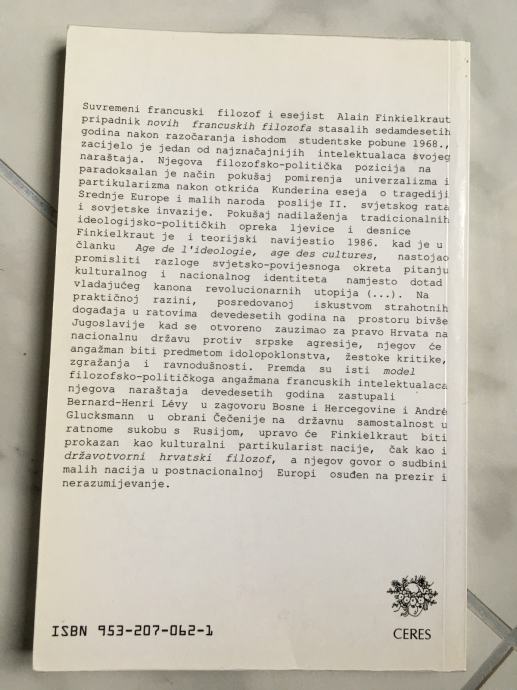 Suvremeni francuski filozof i esejist Alain Finkielkraut, pripadnik novih francuskih filozofa stasalih sedamdesetih godina nakon razočaranja ishodom studentske pobune 1968., zacijelo je jedan od najznačajnijih intelektualaca svojeg naraštaja. Njegova filozofsko-politička pozicija na paradoksalan je način pokušaj pomirenja univerzalizma i partikularizma nakon otkrića Kunderina eseja o tragediji Srednje Europe i malih naroda poslije 2. svjetskog rata i sovjetske invazije. Pokušaj nadilaženja tradicionalnih ideologijsko-političkih opreka ljevice i desnice Finkielkraut je i teorijski navijestio 1986. kad je u članku "Age de l´ideologie, age des cultures", nastojao promisliti razloge svjetsko-povijesnoga okreta pitanju kulturalnog i nacionalnog identiteta namjesto dotad vladajućeg kanona revolucionarnih utopija (...). Na praktičnoj razini, posredovanoj iskustvom strahotnih događaja u ratovima devedesetih godina na prostoru bivše Jugoslavije kad se otvoreno zauzimao za pravo Hrvata na nacionalnu državu protiv srpske agresije, njegov će angažman biti predmetom idolopoklonstva, žestoke kritike, zgražanja i ravnodušnosti. Premda su isti model filozofsko-političkoga angažmana francuskih intelektualaca njegova naraštaja devedesetih godina zastupali Bernard-Henri Lévy u zagovoru Bosne i Hercegovine i André Glucksman u obrani Čečenije na državnu samostalnost u ratnome sukobu s Rusijom, upravo će Finkielkraut biti prokazan kao kulturalni partikularist nacije, čak kao i državotvorni hrvatski filozof, a njegov će govor o sudbini malih nacija u postnacionalnoj Europi biti osuđen na prezir i nerazumijevanje.