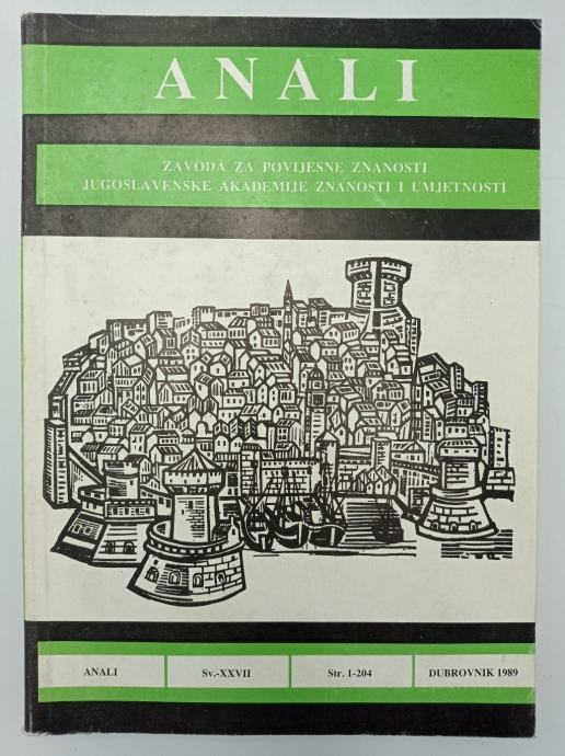 Anali Zavoda za povijesne znanosti JAZU u Dubrovniku, svezak XXVIIKošćak V: Epidaurum-Ragusium-Laus-DubrovnikŽivanović D: Prozori i polifore dubrovačkih kuća i palataKrekić B: Odjek bitke na Krbavskom polju (1493) u DubrovnikuStipetić V: Brojčani pokazatelji razvoja stanovništva na teritoriju negdašnje Dubrovačke Republike u minula tri stoljeća (1673-1981)Dadić Ž: Uloga Karla Scherffera u prihvaćanju i širenju Boškovićevih znanstvenih rezultataPaušek-Baždar S: Boškovićeva gledišta o ulozi topline i svjetlosti u kemijskim promjenamaVekarić N: Sud Janjinske kapetanijeMiović-Perić V: Fermani dubrovačkim pomorcimaPerić I: O stanovništvu dubrovačkog okružja i o jednom dijelu njegove imovine krajem 1830.g.Stojan S: Rijeka Dubrovačka kao književna inspiracija Stranica: 204Dimenzije: 17x24Jezik: DubrovnikPismo: LatinicaStanje: Vrlo dobroUvez: MekiGodina: 1989