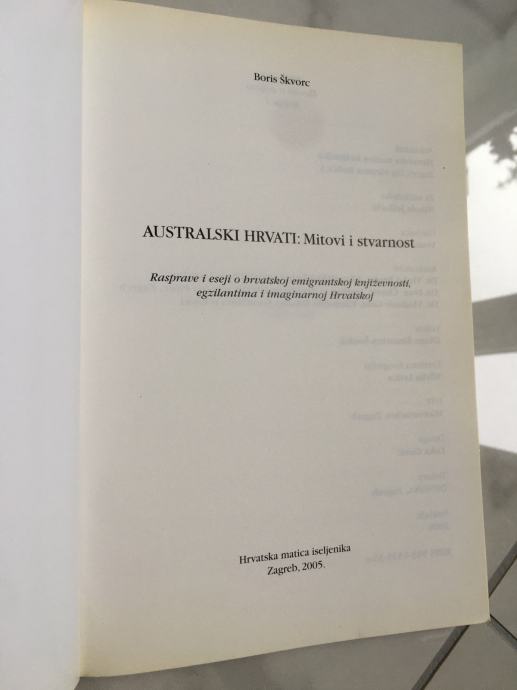 Knjiga se sastoji od rasprava i eseja o Hrvatima i hrvatskoj emigrantskoj književnosti u Australiji, a namjera joj je razbiti stare i uvriježene predodžbe o australskim Hrvatima. Autor Boris Škvorc, predavač hrvatskog jezika i književnosti na Macquarie Universityju u Sydneyju, obradio je podatke o broju Hrvata u Australiji, njihovoj ulozi u australskom društvu, ali i odnos Republike Hrvatske prema svojoj brojnoj zajednici u Australiji. U prilogu knjige nalazi se fotografski zapis iz života hrvatske zajednice u Australiji.