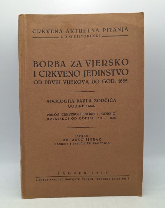 Janko Šimrak: Borba za vjersko i crkveno jedinstvo od prvih vijekova do god. 1685.-Apologija Pavla Zoričića godine 1663.- prilog crvenoj historiji u gornjoj Hrvatskoj od godine 1611-1685.napisao dr. Janko Šimrak, kanonik i sveučilišni profesorStranica: 149Dimenzije: 15.5x23Jezik: ZagrebPismo: LatinicaStanje: OdličnoUvez: MekiGodina: 1939