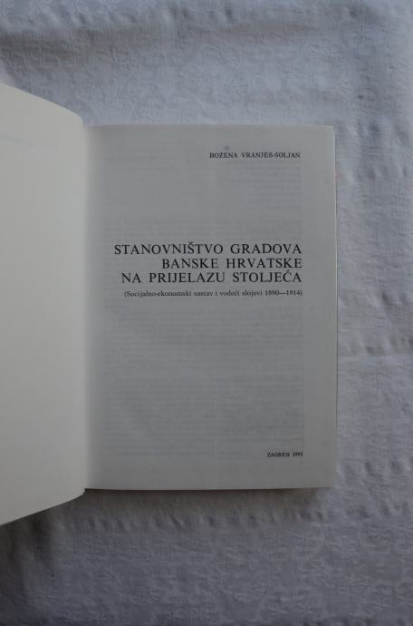 Božena Vranješ-Šoljan - Stanovništvo gradova Banske Hrvatske na prijelazu stoljeća (Socijalno-ekonomski sastav i vodeći slojevi 1890.-1914.) - izdavači Školska knjiga i Stvarnost, Zagreb 1991. godine, 18 x 24 cm, tvrdi uvez i papirnati omot, 298 stranica, ilustrirano.