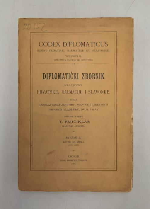 Tadija Smičiklas: Diplomatički zbornik Kraljevine Hrvatske, Dalmacije i Slavonije iiDiplomata seculi XII. continens / Listine XII. vijeka (1101-1200). Stranica: 500Dimenzije: 18x26Jezik: ZagrebPismo: LatinicaStanje: Vrlo dobroUvez: MekiGodina: 1904