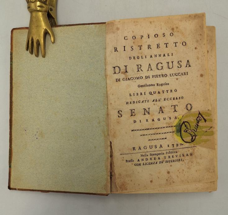 Jakov Lukarević: Copioso ristretto degli annali di Ragusa di Giacomo di Pietro Luccari Gentiluomo Raguseo libri quattro. Dedicari all’Eccelso Senato di RagusaDrugo izdanje.Popis dubrovačkih plemenitih obitelji te popis dubrovačkih nadbiskupa na kraju. Jedino autorovo djelo, kronika Dubrovnika od njegova osnutka do 1600. godine, nastavak i nadopuna povijesti Dubrovnika Serafina Razzija (Lucca, 1595.). Autor, prvi dubovački pisac o dubrovačkoj povijesti, koristio se starim kronikama, dokumentima iz dubrovačkog arhiva, djelima bizantskih zapadnih i istočnih pisaca te usmenom predajom. U predgovoru se obraća svojem prijatelju Marinu Bobaljeviću (Marino de Bobali), koji je pomogao tiskati knjigu te kojemu je knjiga i posvećena, te kritizira povjesničare koji su ranije pisali o Dubrovniku, poput Sansovina. Zbog činjenice da autor navodi i podatke iz djela danas nepoznatih pisaca, ova je kronika značajan doprinos poznavanju dubrovačke povijesti. Autor opisuje i dubrovačke pravne odredbe i običaje, političko i upravno urećenje Dubrovačke Republike, topografiju Dubrovačke Republike, te donosi podatke o Hrvatima u osmanlijskoj službi.Potječe iz ugledne i aristokratske porodice. Bio je član Velikog vijeća i poslanik Dubrovačke Republike u Carigradu, kod Sultana.Dok je boravio u Carigradu, Africi i Bosni, istraživao je veze između Hrvata i muslimana. Napisao je na talijanskom jeziku knjigu Copioso ristretto degli annali di Ravsa, libri qvatro – Opširni izvod iz dubrovačkih ljetopisa u četiri knjige, prvi put objavljeno u Veneciji 1605. Drugo izdanje je izašlo u Dubrovniku 1790.Njegov prikaz dubrovačke povijesti obiluje podacima koje ne nalazimo kod drugih povjesničara i kroničara, posebice za stariju povijest.Lukarević često navodi i izvore svojih podataka koji nam danas nisu poznati.Velik dio podataka crpio je iz Državnog arhiva. Posebice su važni podaci o našim ljudima u turskoj službi. Veliku vrijednost ima i njegova analiza državnog uređenja Dubrovačke Republike.Stranica: 325Dimenzije: 12x17.5Jezik: DubrovnikPismo: LatinicaStanje: Vrlo dobroUvez: TvrdiGodina: 1790