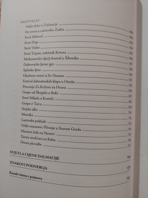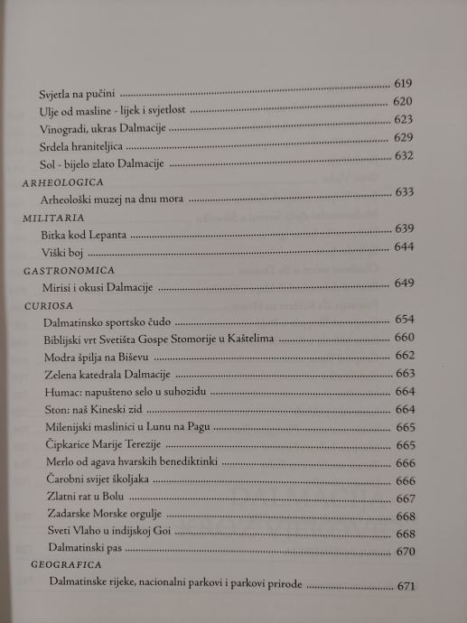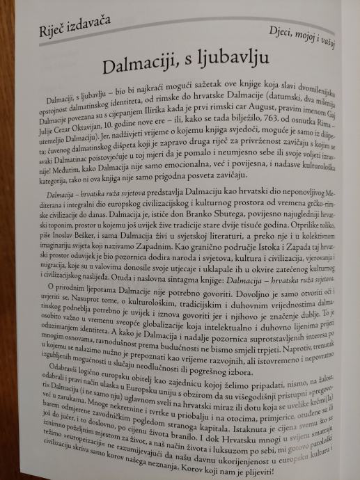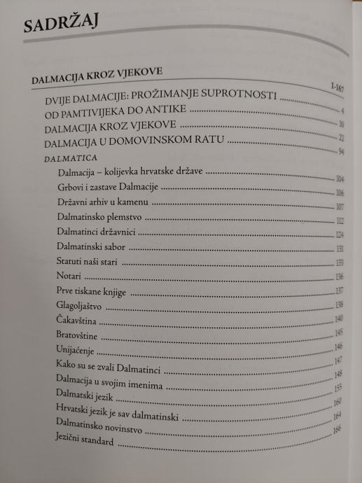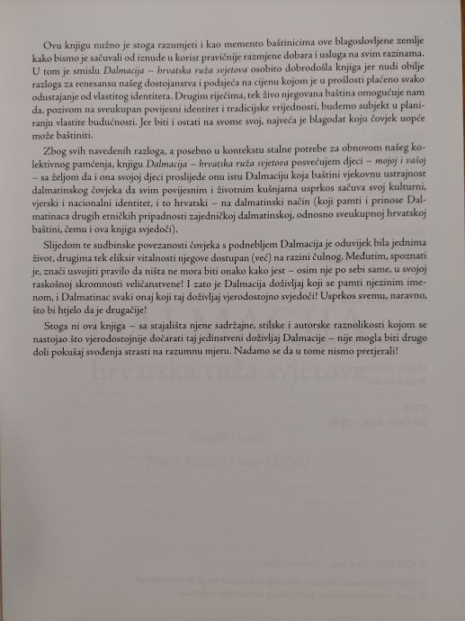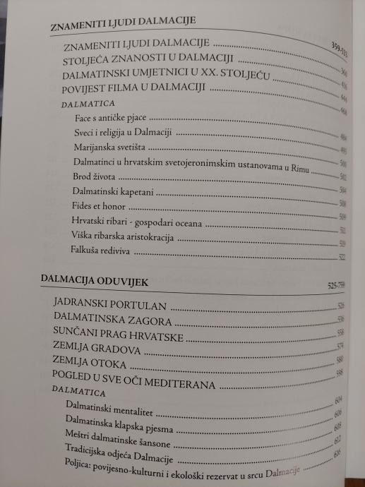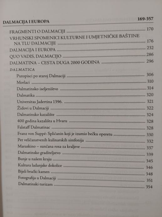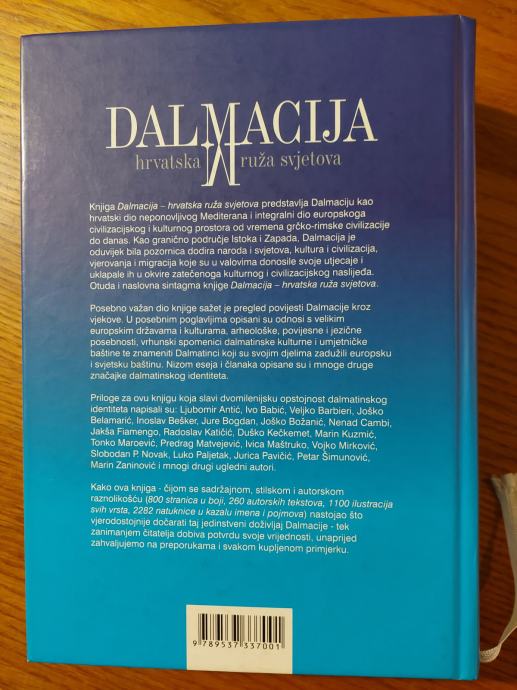 Knjiga predstavlja Dalmaciju kao jedinstvenu hrvatsku regiju, nedjeljivi dio Mediterana i europskog civilizacijskog i kulturnog prostora od vremena grčko-rimske civilizacije do danas, ali i kao dodirnu točku naroda i svjetova, kultura i civilizacija, vjerovanja i migracije koje su u valovima donosile utjecaje i uklapale ih u okvire zatečenog kulturnog i civilizacijskog naslijeđa. Kroz nekoliko cjelina opisuje se njena povijest, znameniti ljudi, njena geografija, arheologija, festivali i dr. Knjiga obuhvaća 800 stranica sa 260 autorskih tekstova i 1100 raznovrsnih ilustracija.