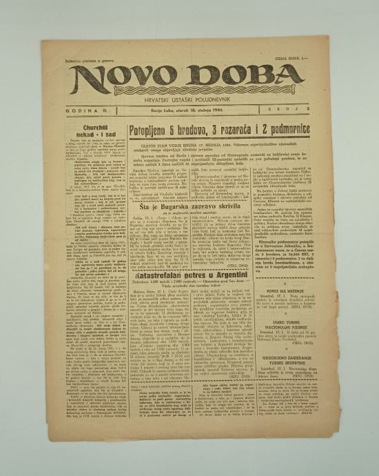 Novo doba br. 3/1944.Hrvatski ustaški tjednikGlavni i odgovorni urednik: Azaudin AganovićStranica: 4Dimenzije: 30.5x43Jezik: ZagrebPismo: LatinicaStanje: DobroUvez: MekiGodina: 1944