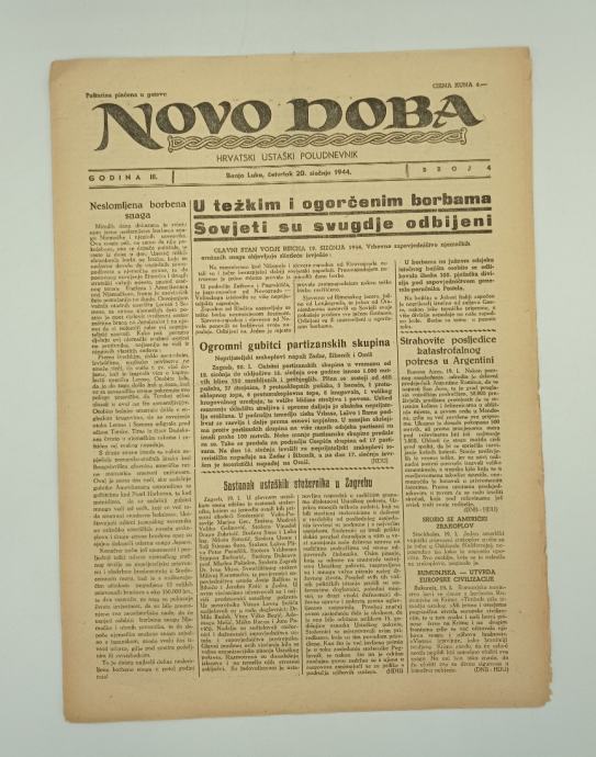 Novo doba br. 4/1944.Hrvatski ustaški tjednikGlavni i odgovorni urednik: Azaudin AganovićStranica: 4Dimenzije: 30.5x43Jezik: Banja LukaPismo: LatinicaStanje: DobroUvez: MekiGodina: 1944