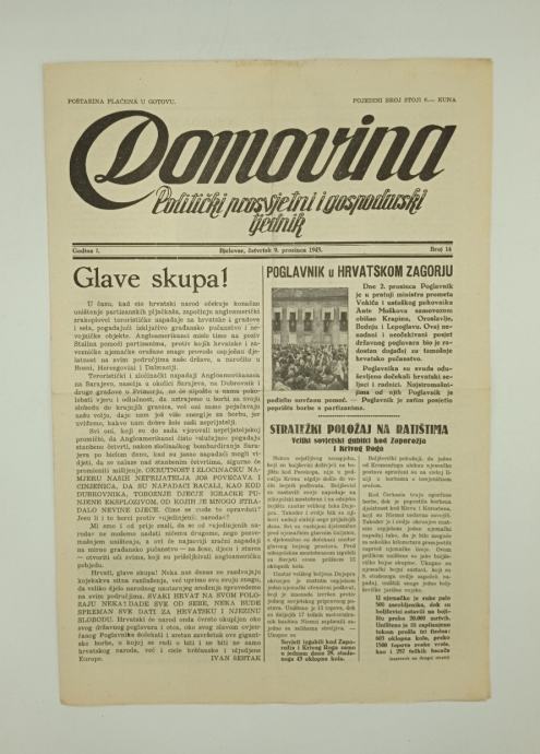 Domovina br. 14/1943.Politički prosvjetni i gospodarski tjednikGlavni i odgovorni urednik: Miljenko MuhaStranica: 6Dimenzije: 30x42Jezik: BjelovarPismo: LatinicaStanje: DobroUvez: MekiGodina: 1943
