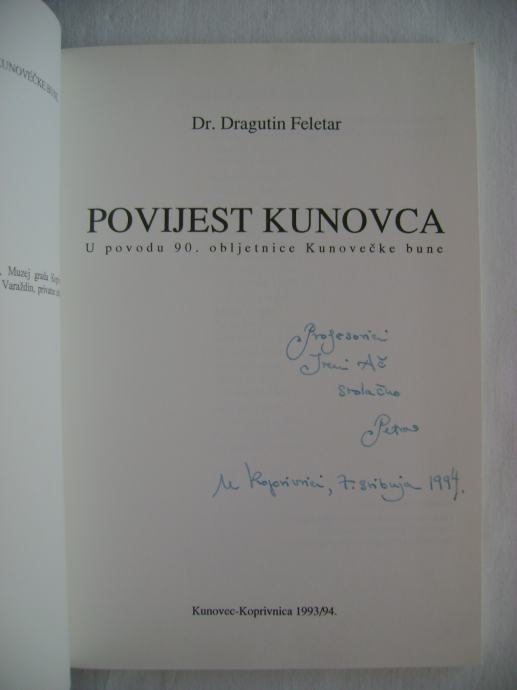 Dragutin Feletar - Povijest Kunovca; U povodu 90. obljetnice Kunovečke bune - izdavač Nakladna kuća "Dr. Feletar", Koprivnica 1993/94. godine, 17 x 24 cm, meki uvez, 101 stranica, bogato ilustrirano.