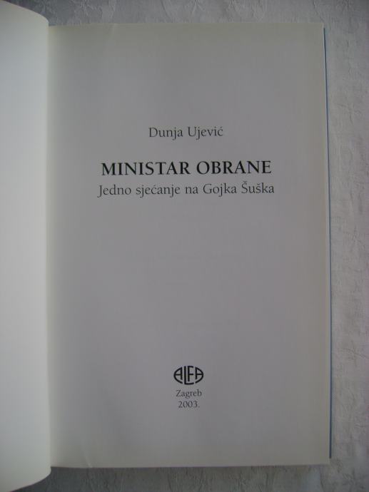 Dunja Ujević - Ministar obrane - Jedno sjećanje na Gojka Šuška - izdavač Alfa d.d. Zagreb, 2003. godine, 13 x 20 cm, tvrdi uvez, 203 stranice, ilustrirano.