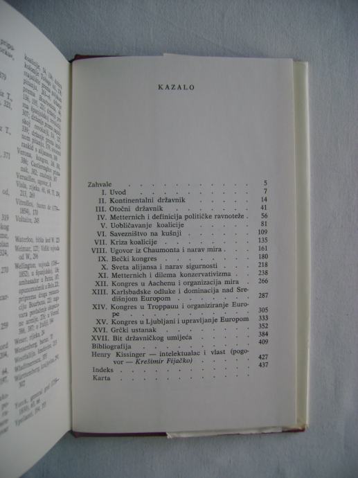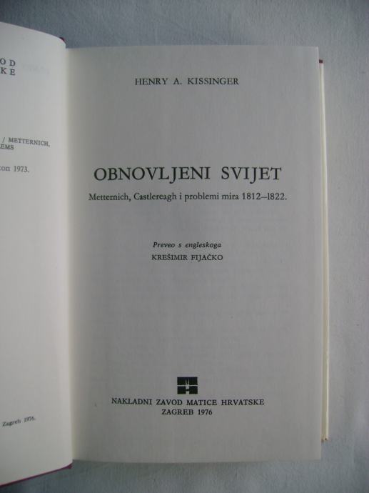 Henry Kissinger - Obnovljeni svijet; Metternich, Castleragh i problemi mira 1812.-1822. - izdavač Nakladni zavod Matice hrvatske, Zagreb 1976. godine, 13 x 20 cm, tvrdi uvez i papirnati omot, 448 stranica.