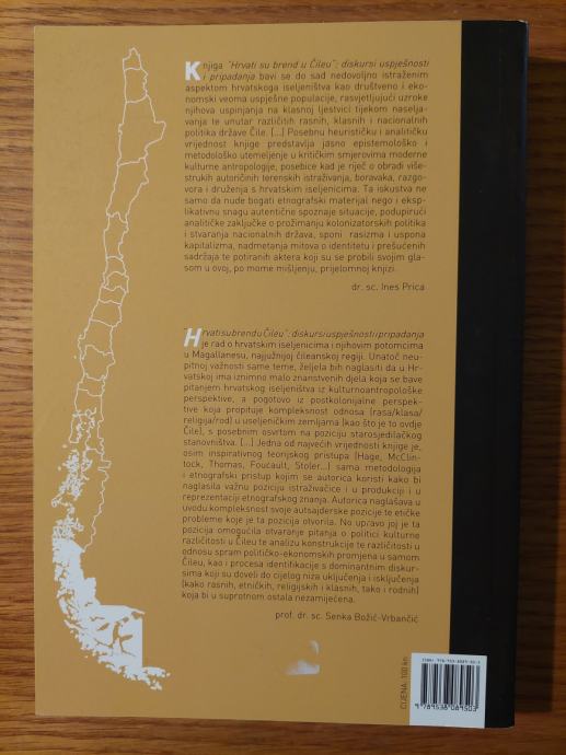 Knjiga “’Hrvati su brend u Čileu’: diskursi uspješnosti i pripadanja” bavi se do sad nedovoljno istraženim aspektom hrvatskoga iseljeništva kao društveno i ekonomski veoma uspješne populacije, rasvjetljujući uzroke njihova uspinjanja na klasnoj ljestvici tijekom naseljavanja te unutar različitih rasnih, klasnih i nacionalnih politika države Čile. […] Posebnu heurističku i analitičku vrijednost knjige predstavlja jasno epistemološko i metodološko utemeljenje u kritičkim smjerovima moderne kulturne antropologije, posebice kad je riječ o obradi višestrukih autoričinih terenskih istraživanja, boravaka, razgovora i druženja s hrvatskim iseljenicima. Ta iskustva ne samo da nude bogati etnografski materijal nego i eksplikativnu snagu autentične spoznaje situacije, podupirući analitičke zaključke o prožimanju kolonizatorskih politika i stvaranja nacionalnih država, sponi rasizma i uspona kapitalizma, nadmetanja mitova o identitetu i prešućenih sadržaja te potiranih aktera koji su se probili svojim glasom u ovoj, po mome mišljenju, prijelomnoj knjizi.