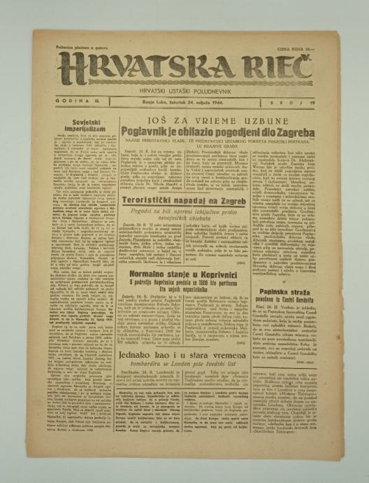 Hrvatska rieč br. 19/1944.Hrvatski ustaški poludnevnikHrvatska rieč izlazi triput tjedno utorkom, četvrtkom i subotomUrednik: Azaudin AganovićStranica: 6Dimenzije: 31x43Jezik: ZagrebPismo: LatinicaStanje: DobroUvez: MekiGodina: 1944