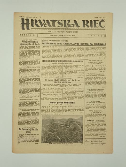 Hrvatska rieč br. 33/1944.Hrvatski ustaški poludnevnikHrvatska rieč izlazi triput tjedno utorkom, četvrtkom i subotomUrednik: Azaudin AganovićStranica: 6Dimenzije: 31x43Jezik: ZagrebPismo: LatinicaStanje: DobroUvez: MekiGodina: 1944