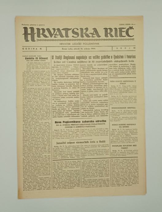 Hrvatska rieč br. 51/1944.Hrvatski ustaški poludnevnikHrvatska rieč izlazi triput tjedno utorkom, četvrtkom i subotomUrednik: Azaudin AganovićStranica: 6Dimenzije: 31x43Jezik: ZagrebPismo: LatinicaStanje: DobroUvez: MekiGodina: 1944