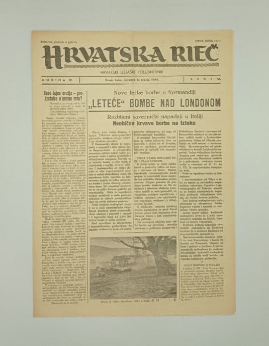 Hrvatska rieč br. 56/1944.Hrvatski ustaški poludnevnikHrvatska rieč izlazi triput tjedno utorkom, četvrtkom i subotomUrednik: Azaudin AganovićStranica: 6Dimenzije: 31x43Jezik: ZagrebPismo: LatinicaStanje: DobroUvez: MekiGodina: 1944