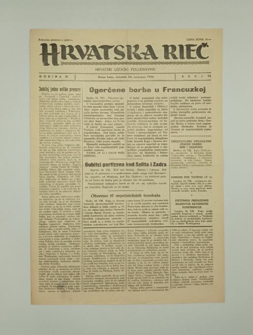 Hrvatska rieč br. 75/1944.Hrvatski ustaški poludnevnikHrvatska rieč izlazi triput tjedno utorkom, četvrtkom i subotomUrednik: Azaudin AganovićStranica: 4Dimenzije: 31x43Jezik: ZagrebPismo: LatinicaStanje: DobroUvez: MekiGodina: 1944