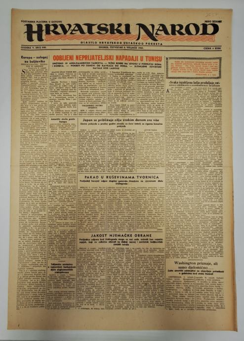 Hrvatski narod - glasilo hrvatskog ustaškog pokreta br. 648/1943. (prvo izdanje)Glavni i odgovorni urednik: Danijel UvanovićHrvatski narod je bio hrvatski tjednik iz Zagreba. Uskoro nakon početka izlaženja postao je dnevnim listom. Glavni urednik mu je bio Mile Budak, a politički urednik je bio Ivan Oršanić. Ravnatelj je bio Marko Čović. Među ostalima, članke su pisali Marko Čović, Ivo Bogdan, Matija Kovačić, Stipe Ćorlukić i drugi. List je postao okosnicom ustaške domovinske organizacije u vrijeme dok su ustaše bili zabranjena organizacija u Jugoslaviji i dok se većina pokreta nalazila u emigraciji. Uspostavom NDH, Hrvatski narod postaje stožernim listom. Stranica: 8Dimenzije: 40x56.5Jezik: ZagrebPismo: LatinicaStanje: Vrlo dobroUvez: MekiGodina: 1943