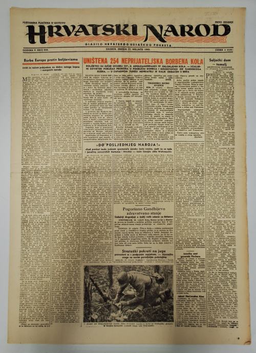 Hrvatski narod - glasilo hrvatskog ustaškog pokreta br. 659/1943. (prvo izdanje)Glavni i odgovorni urednik: Danijel UvanovićHrvatski narod je bio hrvatski tjednik iz Zagreba. Uskoro nakon početka izlaženja postao je dnevnim listom. Glavni urednik mu je bio Mile Budak, a politički urednik je bio Ivan Oršanić. Ravnatelj je bio Marko Čović. Među ostalima, članke su pisali Marko Čović, Ivo Bogdan, Matija Kovačić, Stipe Ćorlukić i drugi. List je postao okosnicom ustaške domovinske organizacije u vrijeme dok su ustaše bili zabranjena organizacija u Jugoslaviji i dok se većina pokreta nalazila u emigraciji. Uspostavom NDH, Hrvatski narod postaje stožernim listom. Stranica: 8Dimenzije: 40x56.5Jezik: ZagrebPismo: LatinicaStanje: Vrlo dobroUvez: MekiGodina: 1943