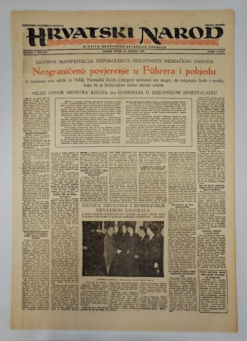 Hrvatski narod - glasilo hrvatskog ustaškog pokreta br. 661/1943. (drugo izdanje)Glavni i odgovorni urednik: Danijel UvanovićHrvatski narod je bio hrvatski tjednik iz Zagreba. Uskoro nakon početka izlaženja postao je dnevnim listom. Glavni urednik mu je bio Mile Budak, a politički urednik je bio Ivan Oršanić. Ravnatelj je bio Marko Čović. Među ostalima, članke su pisali Marko Čović, Ivo Bogdan, Matija Kovačić, Stipe Ćorlukić i drugi. List je postao okosnicom ustaške domovinske organizacije u vrijeme dok su ustaše bili zabranjena organizacija u Jugoslaviji i dok se većina pokreta nalazila u emigraciji. Uspostavom NDH, Hrvatski narod postaje stožernim listom. Stranica: 8Dimenzije: 40x56.5Jezik: ZagrebPismo: LatinicaStanje: Vrlo dobroUvez: MekiGodina: 1943