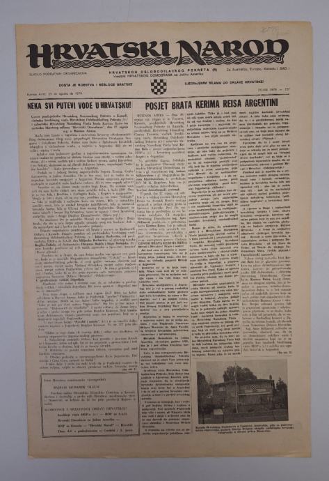 Hrvatski narod - glasilo područnih organizacija hrvatskog oslobodilačkog pokreta br. 157/1979.Viestnik Hrvatskog domobrana za Južnu Ameriku, Australiju, Europu, Kanadu i SADUrednik: Miron Krešimir BegićStranica: 8Dimenzije: 31.5x46Jezik: Buenos AiresPismo: LatinicaStanje: Vrlo dobroUvez: MekiGodina: 1979