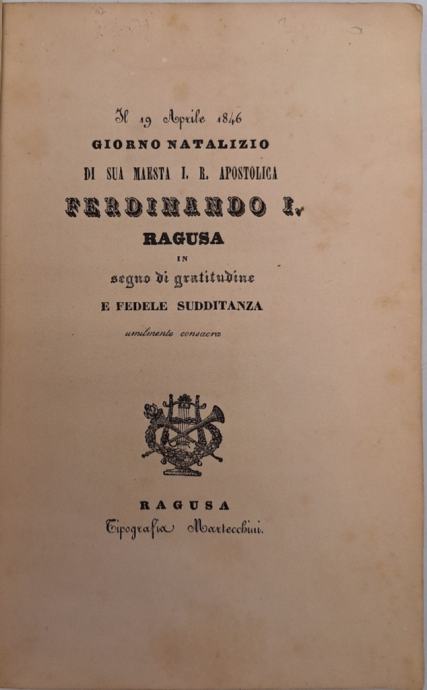 Il 19 Aprile 1846 giorno natalizio di Sua Maesta i.r. apostolica Ferdinando I. : Ragusa in segno di gratitudine e fedele sudditanza umilmente consacraTiskar: Petar FranjoStranica: 32Dimenzije: 15x23Jezik: DubrovnikPismo: LatinicaStanje: DobroUvez: MekiGodina: 1846