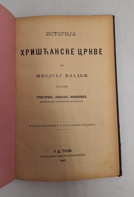 Grigorije Živković: Istorija hrišćanske crkve Stranica: 186Dimenzije: 13x20Jezik: TuzlaPismo: ĆirilicaStanje: Vrlo dobroUvez: TvrdiGodina: 1897