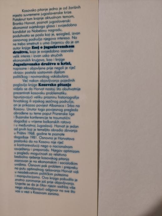 "Već nakon objavljivanja pojedinih poglavlja knjige Kosovsko pitanje vidjelo se da Horvat nastoji što obuhvatnije prezentirati kosovsku problematiku. Ispunjavajući veliku prazninu historiografije hrvatskog ili srpskog jezičnog područja, on je prikazao povijest Albanaca i Srba na Kosovu. Unutar toga povijesnog pregleda obrađene su teme poput Prizrenske lige i Bujanske konferencije te traumatični događaji u vrijeme balkanskih ratova i u međuratnoj Jugoslaviji. Horvat je jedan od prvih koji je temeljito obradio zbivanja u Prištini 1968. godine te poznate događaje 1981. Osnovna je Horvatova postavka da na Kosovu nije riječ o kontrarevoluciji nego o nacionalnom osvještenju i preporodu. Njegov optimizam u pogledu mogućnosti za relativno bezbolno rješenje kosovskog pitanja zasnovan je na ekonomskim i sociološkim uvidima. Osnovni pak problem i prepreku na putu optimalnog rješavanja Horvat vidi u neadekvatnim političkim potezima i manipulacijama. Ova knjiga pobudila je znatno zanimanje još prije objavljivanja. Uvjerite se da je čitav njezin sadržaj više nego zadovoljavajući odgovor na sve što vas u vezi s Kosovom zanima."