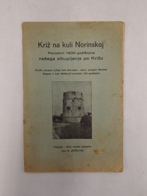 Radovan Jerković: Križ na kuli NorinskojPovodom 1900-godišnjice našega otkupljenja po KrižuKratki povijesni prikaz kule Norinske i novije povijesti Neretve.Napose o župi Metkovići povodom 200-godišnjice.Slavnim našim pređima, koji nam svojom krvlju sačuvaše, sto nam Krist pred 1900 godina svojom krvlju steče-Stranica: 24Dimenzije: 15x22.5Jezik: SplitPismo: LatinicaStanje: DobroUvez: MekiGodina: 1934