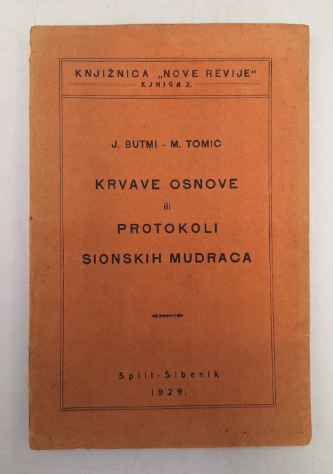 Georgij Butmi: Krvave osnove ili Protokoli Sionskih mudracaZbirka zapisnika tajnih sjednica židovskih poglavica za I. sionističkog kongresa u Baselu 1897. "Protokoli sadržavaju grozan plan, po kome su židovski prvaci naumili da unište sve države i pod svoj jaram podvrgnu cio svijet" (iz predgovora). Prvo hrvatsko izdanje, meki uvez Stranica: 91Dimenzije: 15.5x23Jezik: SplitPismo: LatinicaStanje: Vrlo dobroUvez: MekiGodina: 1929