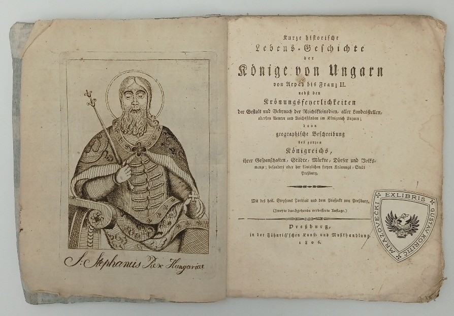 Kurze historische Lebens-geschichte der Konige Von Ungarn von Arpad bis Franz II.Kratka povijest ugarskih kraljeva od Arpadovića do Franje II. i osvrt na hrvatske zemlje u sklopu Personalne unije s Ugarskom. Knjiga sadrži dvije vedute; mađarskog kralja Stjepana I. i lijepu vedutu Požuna.Na prvoj stranici nalazi se ex libris: Gustav Koritić Mrazovečki. Stranica: 83Dimenzije: 20x24Jezik: BratislavaPismo: GoticaStanje: Vrlo dobroUvez: MekiGodina: 1806