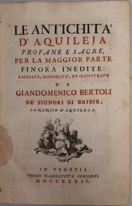Gian Domenico Bertoli: Le antichita' d'Aquileja profane e sacre, per la maggior parte finora inediteKnjiga sadrži natpise iz rimskog doba, kao i novce, pečate i slike iz patrijarhalnog doba. U tekst su uključene stotine ilustracija koje prikazuju novčiće, nadgrobne spomenike i druge arheološke značajke.Stranica: 495Dimenzije: 22x32.50Jezik: VenecijaPismo: LatinicaStanje: Vrlo dobroUvez: TvrdiGodina: 1739