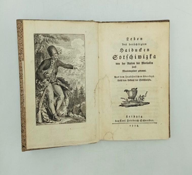 Ivan Lovrić: Leben der berüchtigten Haiducken Sotschiwizka von der Nation der Morlacken sonst Montenegriner genanntAus dem Italiänischen übersezt. Nebst dem Bildniß von Sotschiwizka.Vrlo rijetko njemačko izdanje života hajduka Stanislava Sočivice.Prvi poznati primjerak u Hrvatskoj!Sočivica, Stanko (Stanislav), protuosmanski ratnik (kraj Trebinja, prva polovica XVIII. st. – ?, druga polovica XVIII. st.). Bio je podanik osmanskih plemića Umetalčića, koje je, zbog tiranije, ubio zajedno sa svojom braćom. Prešao je potom na mletački teritorij, na područje Imotskoga, gdje se uglavnom bavio trgovinom i hajdučijom. Pred osmanskom osvetom sklonio se oko 1754. na hrvatski teritorij (Karlovac), ali su ga 1757. Osmanlije zarobili kraj Udbine. Kako bi izbjegao smrtnu kaznu, prešao je na islam i uzeo ime Ibrahim, ali je već iduće godine prebjegao u Dalmaciju, uzeo staro ime i vratio se na pravoslavlje. Poveo je potom niz hajdučkih pohoda na osmanski teritorij (sve do Sarajeva i Mostara), tražeći od bosanskog paše da oslobodi njegovu obitelj iz zarobljeništva u Travniku. Pošto je oko 1762. uspio u svojoj nakani, neko je vrijeme boravio na teritoriju Mletačke Dalmacije, a povremeno i na hrvatskom teritoriju sjeverno od Zrmanje. Nakon 1770. povukao se u Liku i nastanio u Gračacu. Od austrijskih je vlasti uspio ishoditi stalnu plaću i posjed te je bio imenovan harambašom.Lovrić, Ivan, hrvatski pisac (Sinj, oko 1754 – Sinj, 14. XI. 1777). Studirao je jezike i filozofiju u Veneciji, a medicinu u Padovi. God. 1776. objavio je Bilješke o Putu po Dalmaciji opata Alberta Fortisa i život Stanislava Sočivice (Osservazioni di Giovanni Lovrich sopra diversi pezzi del Viaggio in Dalmazia del signor abate Alberto Fortis coll’aggiunta della vita di Soçivicza), osvrt na Putovanje po Dalmaciji (1774) A. Fortisa. Prva dva dijela knjige, O toku Cetine i O običajima Morlaka, puna su zamjerki na Fortisovo pisanje, a sadrže povijesne i arheološke podatke te etnografsku građu s područja Sinjske krajine, ali i šire srednje Dalmacije. Lovrić je obradio folklorističke, etnološke i socioantropološke teme te opisao mnogobrojne zanimljivosti o vremenu, klimi i meteorologiji kontinentalnoga dijela Dalmacije. U trećem je dijelu opisao život hajduka Stanka Sočivice. Uz domoljublje u djelu su izražene i prosvjetiteljske težnje. Knjiga je izazvala kritike mnogih suvremenika, a i samoga Fortisa.Ex libris "Bibliothek des Geh. R. u. Caz. Carl Gerds v. Ketelhodt acquiriert zum allgemeinen Besten von Ludwig Friedrich Fürsten zu Schwarzburg Rud. 1804".Carl Gerd v. Ketelhodt, poznat i kao Carl Gerhard i Carl Gerth (1738. - oko 1794.) bio je tajni savjetnik i kancelar knezova Schwarzburga. Carl Gerd potječe iz stare obitelji Ketelhodt. Bio je sin kancelara Christiana Ulricha von Ketelhodta i njegove supruge Marie Katharine rođene von Beulwitz (1703.-1769.). U dobi od 14 godina počeo je studirati pravo u Jeni kod Christiana Gottlieba Budera, Johanna Augusta von Hellfelda i Karla Friedricha Walcha. U siječnju 1758. doktorirao je i vratio se u rodni grad. Tamo je stupio u državnu službu i imenovan pravim tajnim savjetnikom i kancelarom 1785. godine. Skupljao je i slike i knjige. Njegovu biblioteku od 16 000 svezaka kupio je princ Ludwig Friedrich II i spojio je s “Historischen Bibliothek Rudolstadt”, koja se sada nalazi u Staroj gradskoj vijećnici.Stranica: 92Dimenzije: 10.5x17Jezik: LeipzigPismo: GoticaStanje: Vrlo dobroUvez: TvrdiGodina: 1778